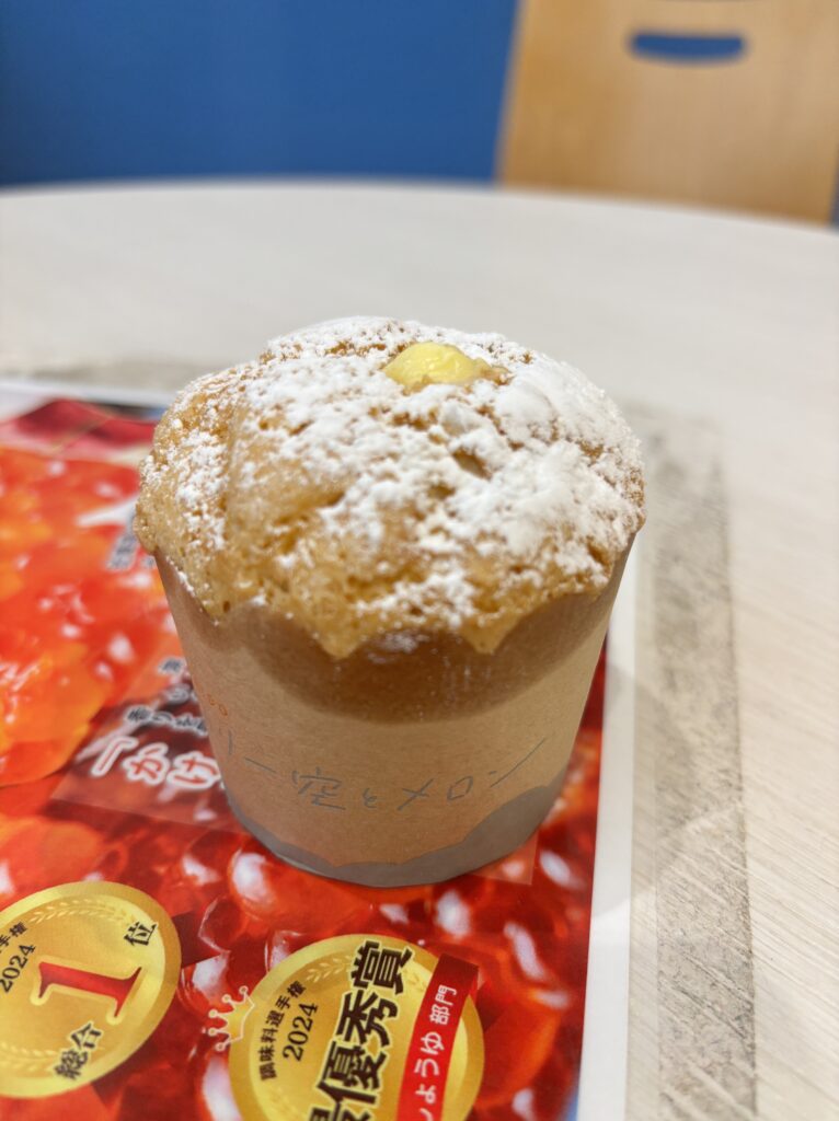 メロンパンマフィン。頭がメロンパンの生地で、中にはカスタードクリーム。