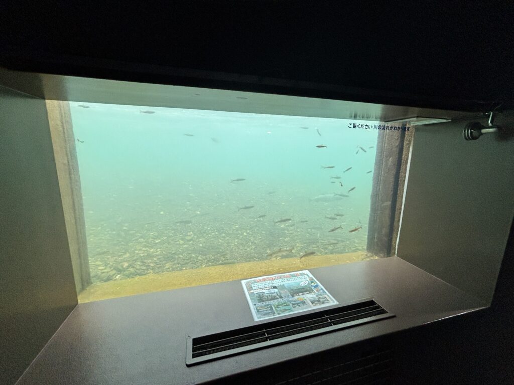この窓から千歳川が除けます。鮭の遡上の季節は鮭が見えるようです。