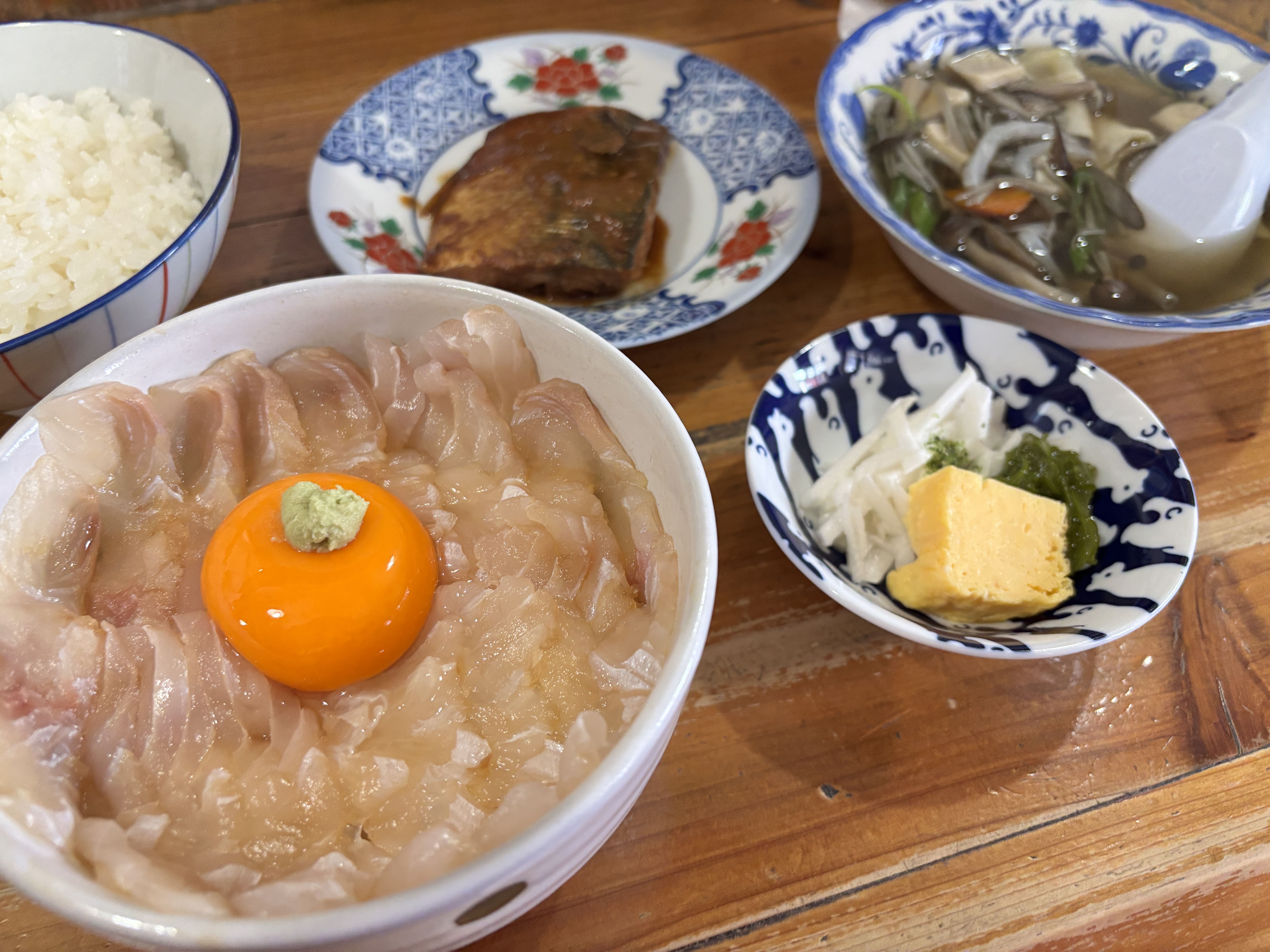ひらめ漬け丼とせんべい汁のセット 1550円 と サバ味噌とご飯900円